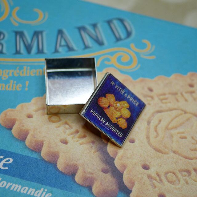 クッキーアソートのブリキの缶です サイズ:20mm x 20mm 厚さ約8mm