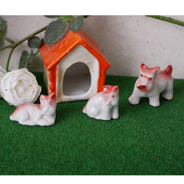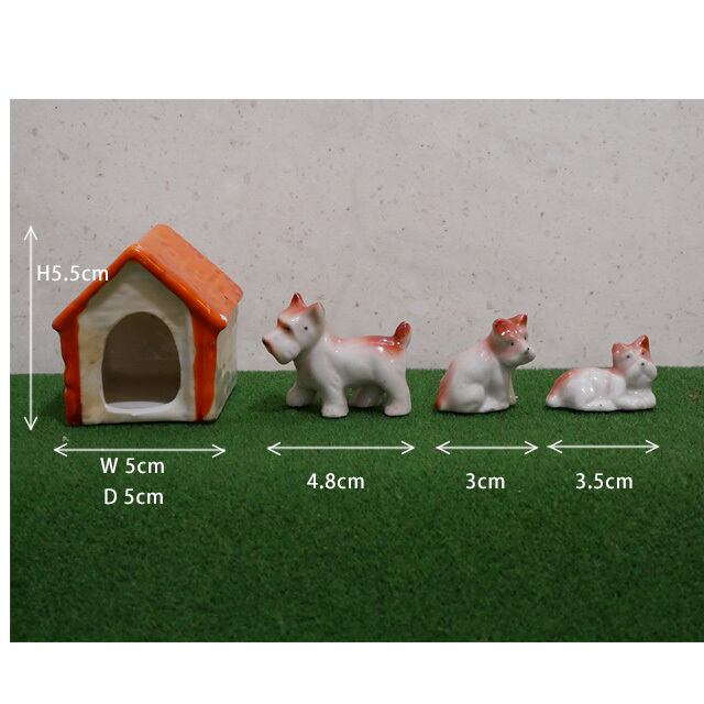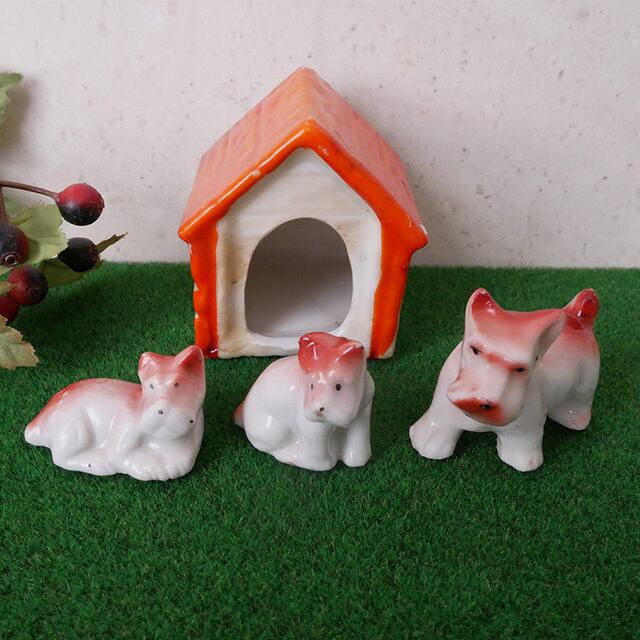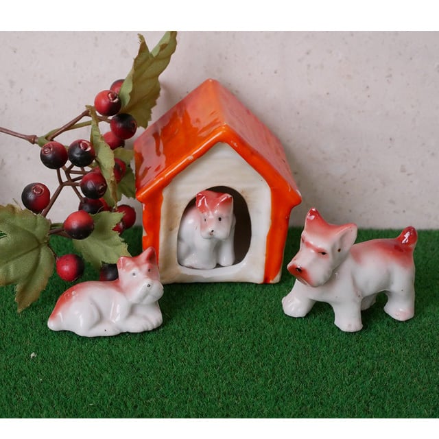 陶器でできたドッグハウスと3匹の犬の親子の可愛いセットです