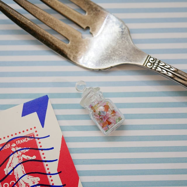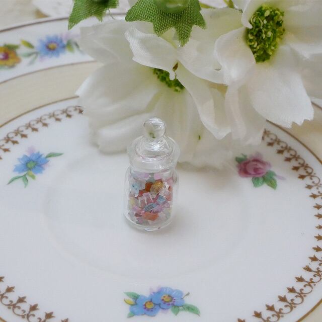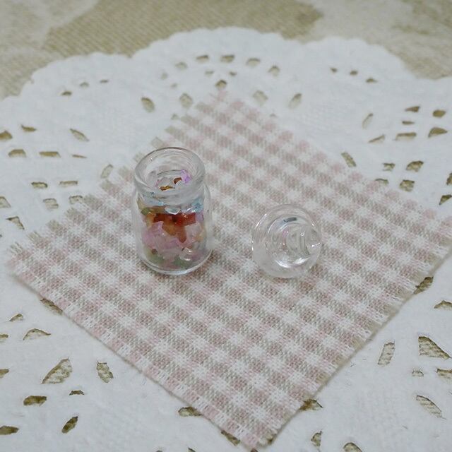 小さなガラス瓶にキャンディーがいっぱい入っています
