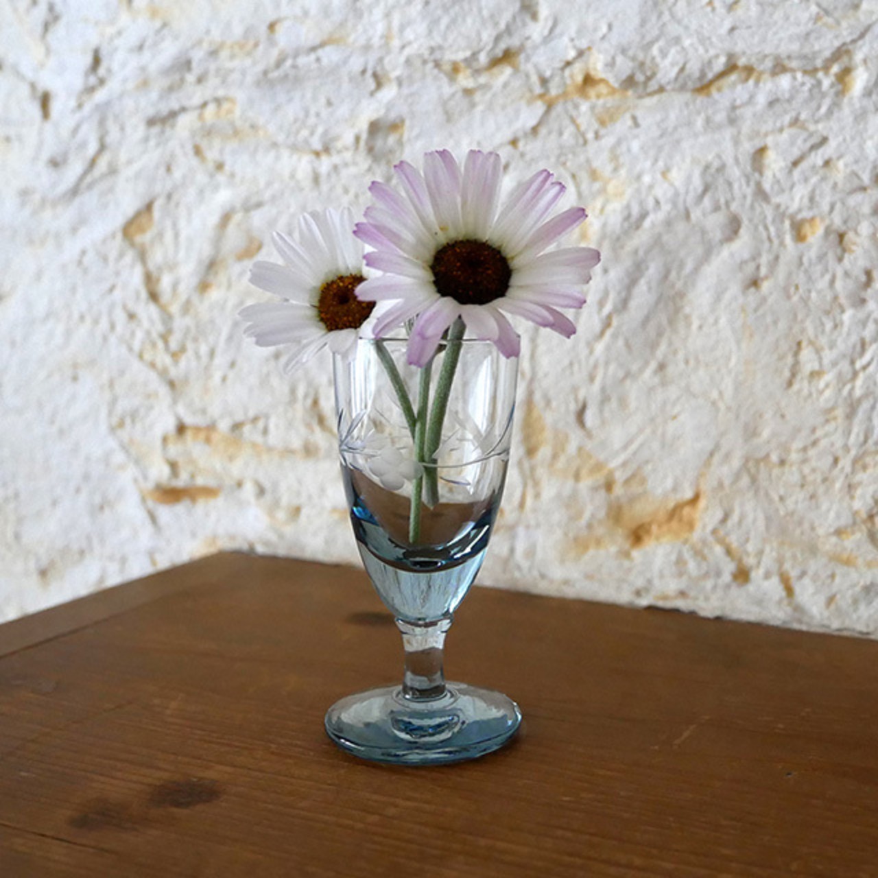 淡いブルー色のミニグラス 側面にお花の模様が入っています サイズは4枚目の写真に記入しました
