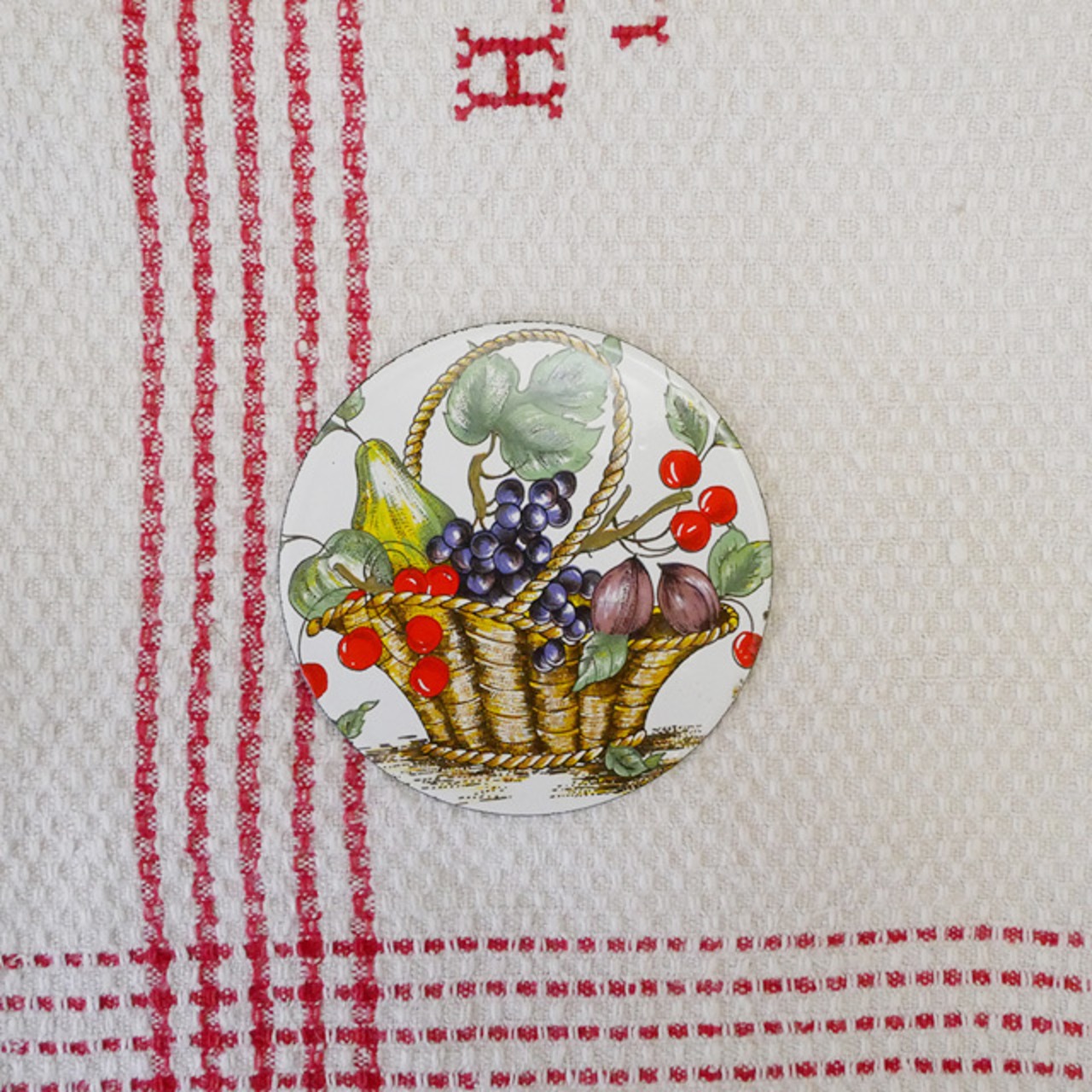 バスケットにいろんなフルーツが入りとてもゴージャスな図柄のホーロー製のコースター